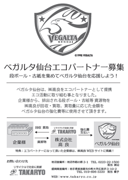 株式会社高良では、リサイクルを通じベガルタ仙台を応援いただけるエコパートナー企業様を、随時募集いたしております。