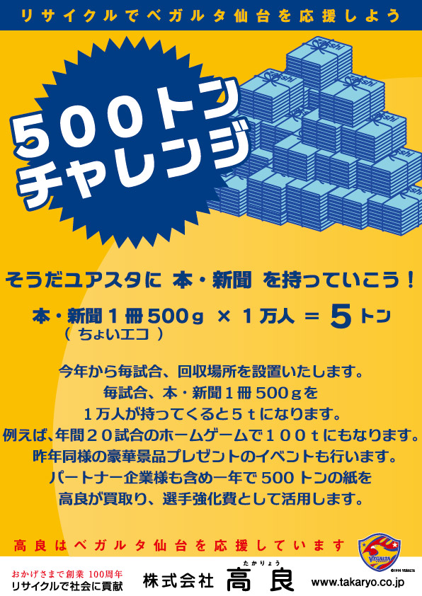 【そうだユアスタに本・新聞を持って行こう!】『リサイクルでベガルタ仙台を応援しよう!! 500トン チャレンジ』実施のお知らせ
