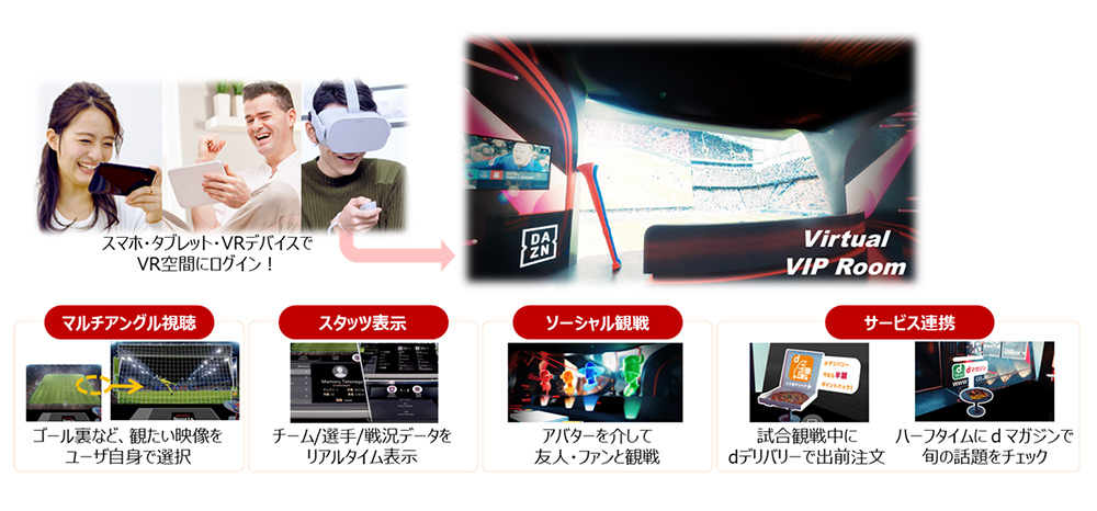 株式会社NTTドコモが3月8日(金)から3月31日(日)まで提供するサービスで、専用アプリ「docomo Sports VR powered by DAZN」をダウンロードしたスマートフォンやタブレット、VRデバイスを使用して、VR空間内のバーチャルVIPルームでスポーツ観戦のライブやアーカイブを楽しめます。マルチアングルでの視聴、リアルタイムに更新される試合情報(スタッツ)を閲覧しながら観戦できる機能をはじめ、さまざまな機能で、これまでにない新たなスポーツ観戦体験を提供します。