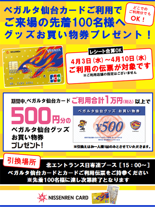 【4月10日 ルヴァン 柏戦】【先着100名限定】ベガルタ仙台カードご利用の方にグッズお買い物券プレゼント!!