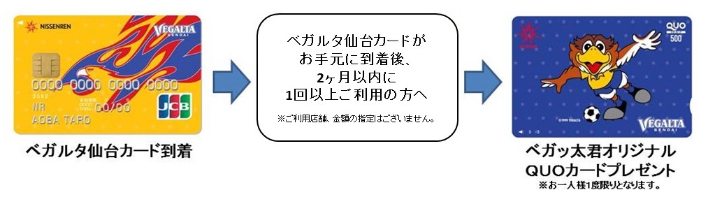 ベガルタ仙台カードが到着後、2か月以内に1回以上カードをご利用の方へ「ベガッ太君オリジナルQUOカード500円分」をプレゼントしております。