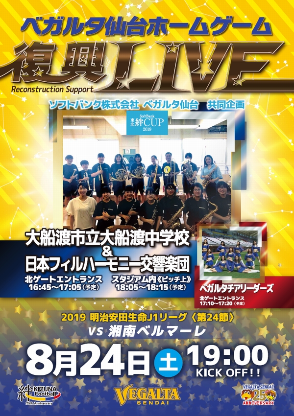 8月24日(土)開催、2019明治安田生命J1リーグ 第24節 湘南ベルマーレ戦の復興ライブは、ソフトバンク株式会社との共同企画で「ソフトバンク東北絆CUP」を開催いたします。ソフトバンクでは、昨年から復興支援として被災地の子どもたちにスポーツや文化活動の機会を提供する「ソフトバンク東北絆CUP」を実施しています。