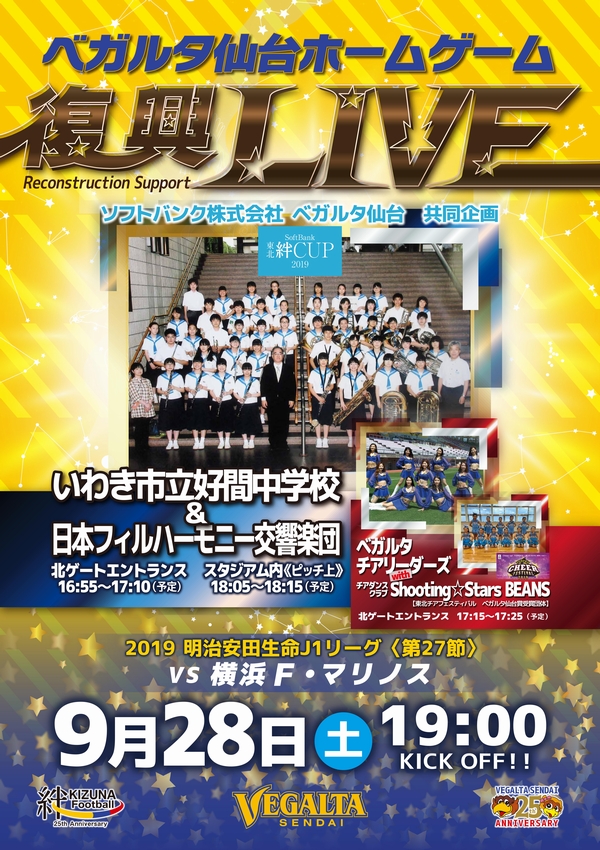 9月28日(土)開催、2019明治安田生命J1リーグ 第27節 横浜F・マリノス戦の復興ライブは、ソフトバンク株式会社との共同企画で「ソフトバンク東北絆CUP」を開催いたします。ソフトバンクでは、昨年から復興支援として被災地の子どもたちにスポーツや文化活動の機会を提供する「ソフトバンク東北絆CUP」を実施しています。