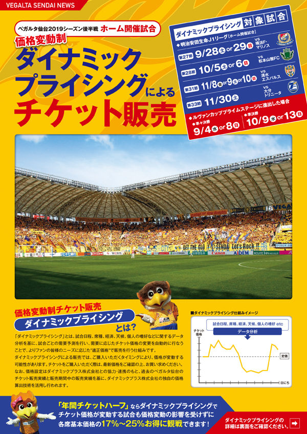 なお価格設定はダイナミックプラス株式会社との協力・連携のもと、過去のベガルタ仙台のチケット販売実績と販売期間中の販売実績を基に、ダイナミックプラス株式会社の独自の価格算出技術を活用し行われます。