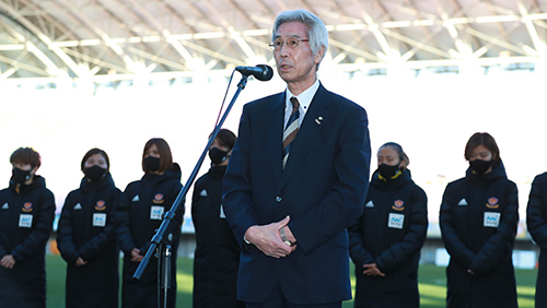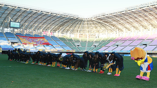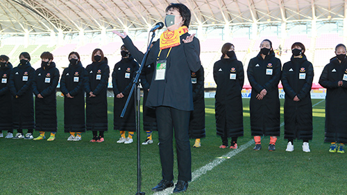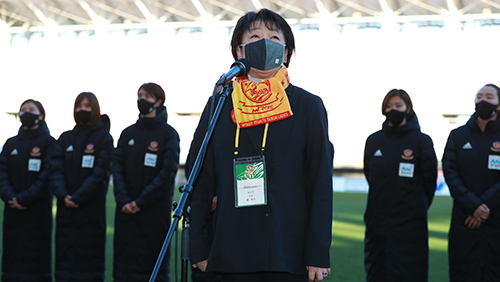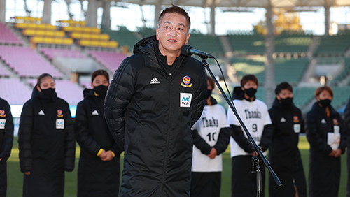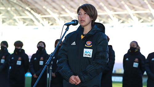 続いて、株式会社ベガルタ仙台代表取締役社長 菊地秀逸、辛島啓珠監督、そして選手を代表してキャプテン MF 7 隅田凜選手よりこれまでのチームへのご支援、ご声援に感謝を込めて、サポーターのみなさまへあいさつをいたしました。