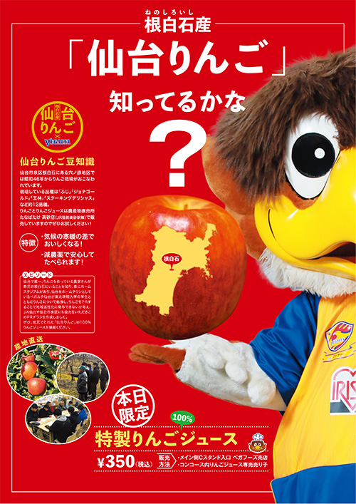 仙台りんごは根白石にある穴ノ原地区で昭和46年から栽培され、気候の寒暖差でおいしく、減農薬で安心して食べることができます。当クラブはホームスタジアムがある泉区に仙台で唯一りんごを作る農家がいることを知り、PRすることで地域活性化に寄与できないかと考え、東北学院大学、泉区、JA仙台にご協力いただき、企画いたしました。