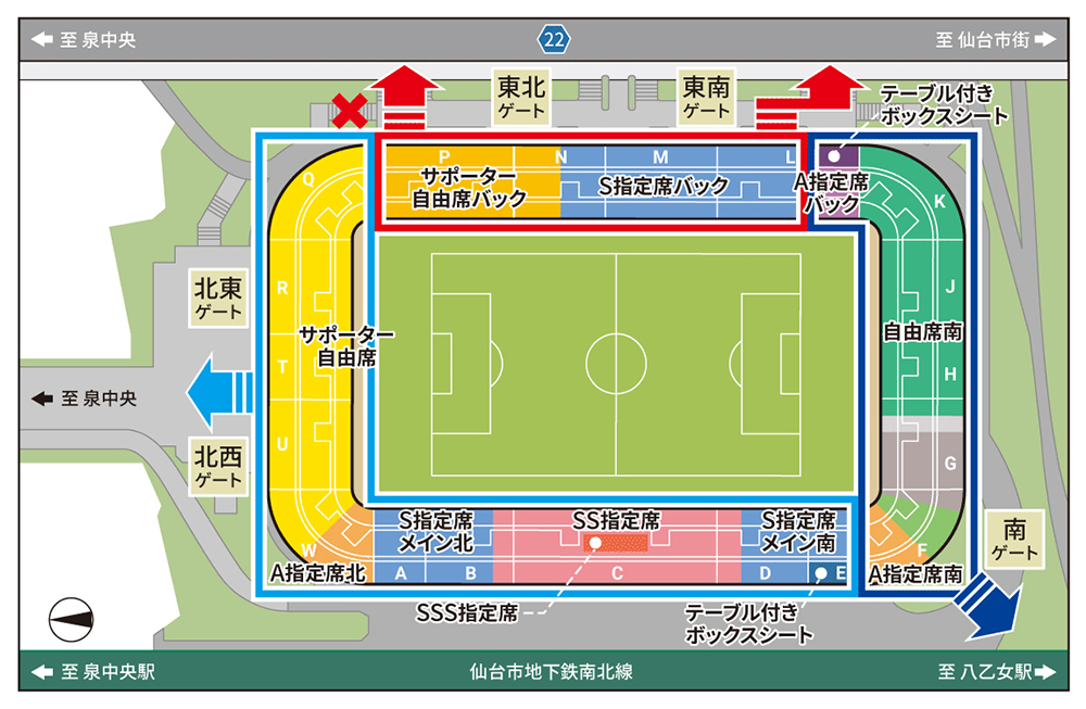 ・スタジアム外周にある北東の階段については、北側ゲートから八乙女駅をご利用になる方のために、北側から東ゲートエントランスへの通行のみ可といたします。東側から北ゲートエントランスへは通行できません。