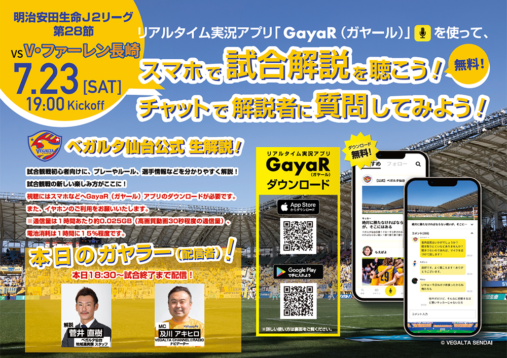 ベガルタ仙台公式生解説 リアルタイム実況アプリ「GayaR」を使ってスマホで聴ける試合解説を実施いたします。チャットで解説者に質問もできます!