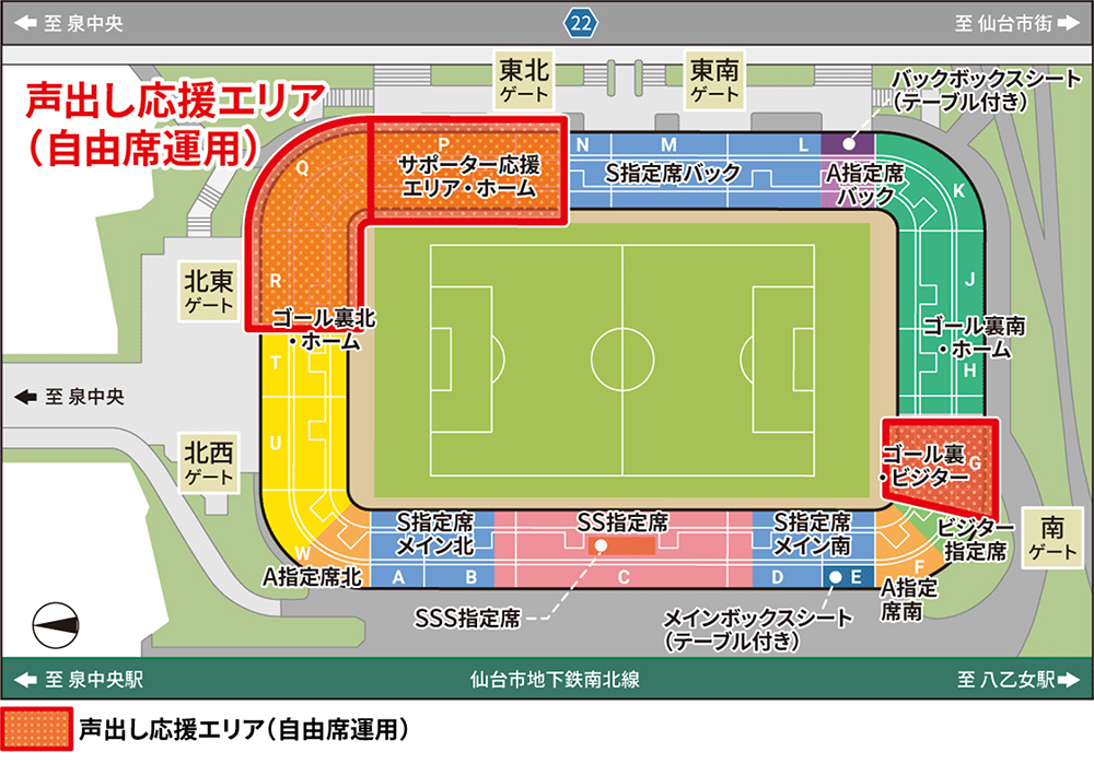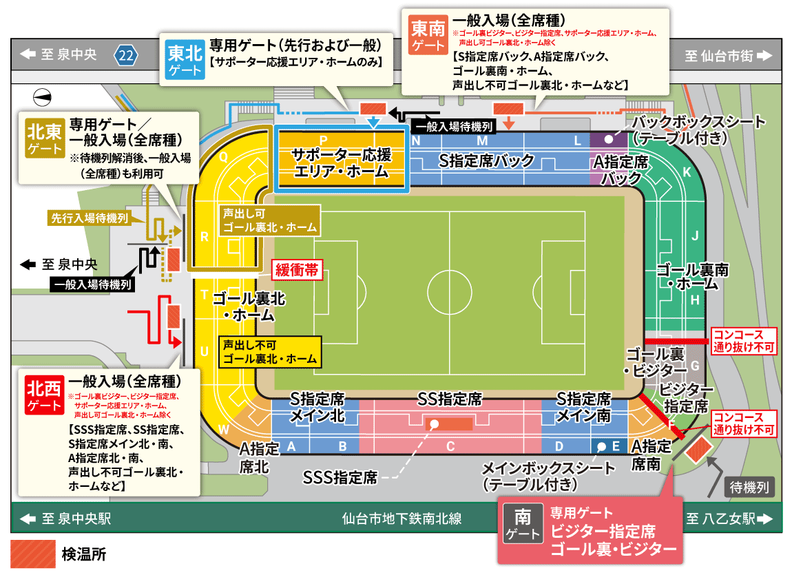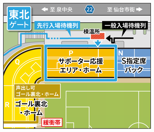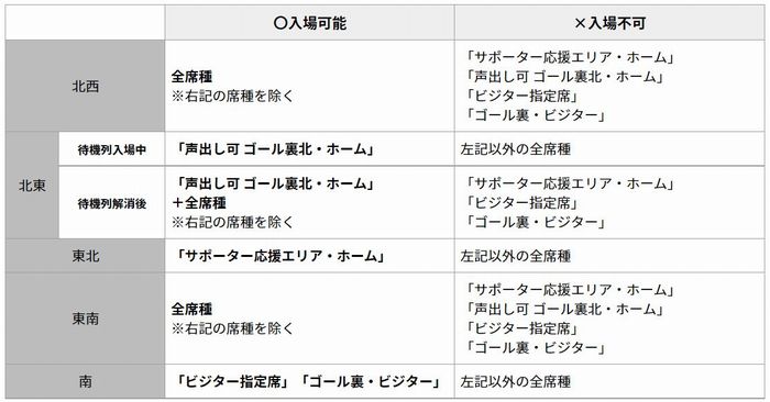 ・「サポーター応援エリア・ホーム」「声出し可 ゴール裏北・ホーム(QおよびRエリア)」「ゴール裏・ビジター」の3席種