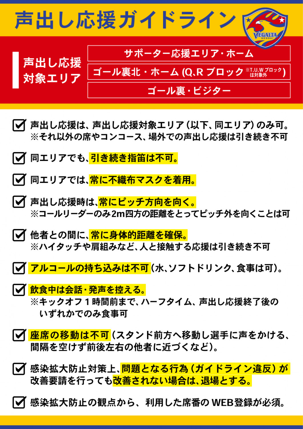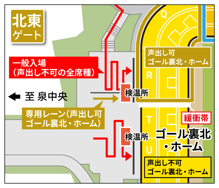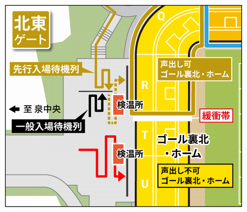 ※ゴール裏北・ホームのT、U、Wエリアについては、引き続き声出し応援不可