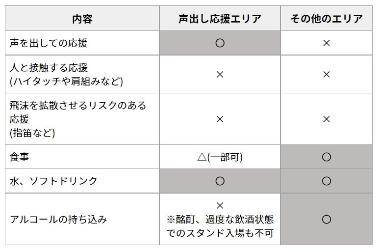 ・エリア内は水、ソフトドリンク、食事の持ち込みを可といたします。ただし食事については、キックオフ1時間前まで、ハーフタイム、声出し応援終了後のいずれかで行ってください。また、飲食中は会話、発声をお控えいただき、飲食後は速やかにマスクを着用してください。
