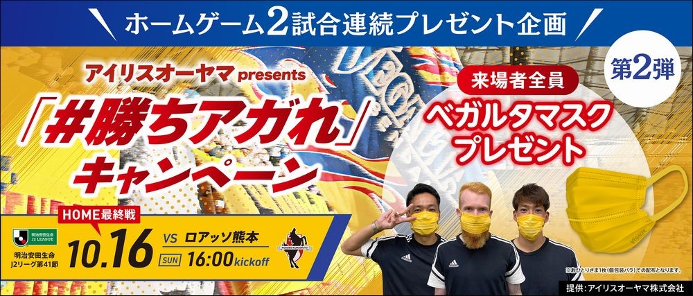 アイリスオーヤマ株式会社さまの特別協賛のもと、対象試合にご来場いただいたみなさまに、同社製のベガルタマスクを来場者全員にプレゼントいたします。勝ちアガるために、ベガルタゴールドを身に付けてチームを後押ししましょう!