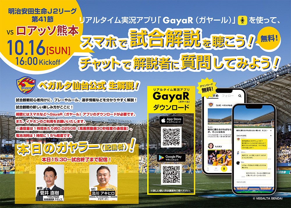 ベガルタ仙台公式生解説 リアルタイム実況アプリ「GayaR」を使ってスマホで聴ける試合解説を実施いたします。チャットで解説者に質問もできます!