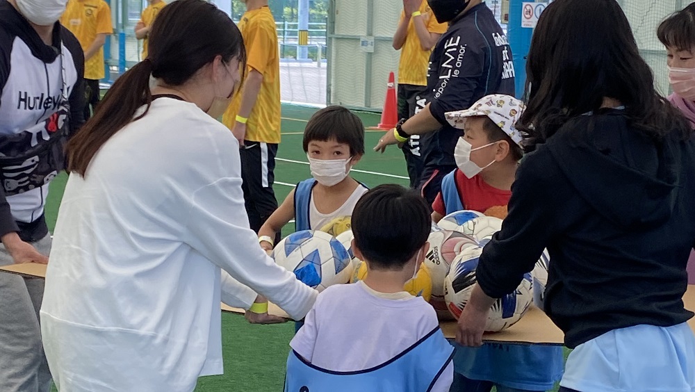 最後は、ベガルタ仙台アカデミーコーチによるボール運動。パス練習、手をつないでのゲーム、元気に体を動かします。