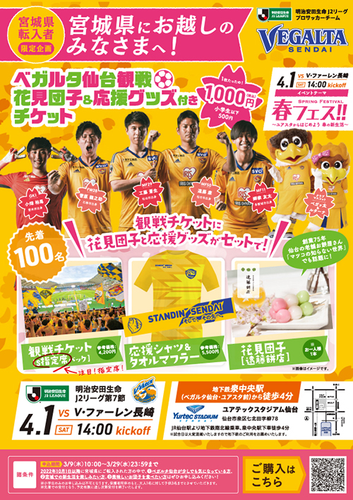 4月1日(土)開催、明治安田生命J2リーグ 第7節 V・ファーレン長崎戦で宮城県転入者限定の特別チケットを販売いたします。