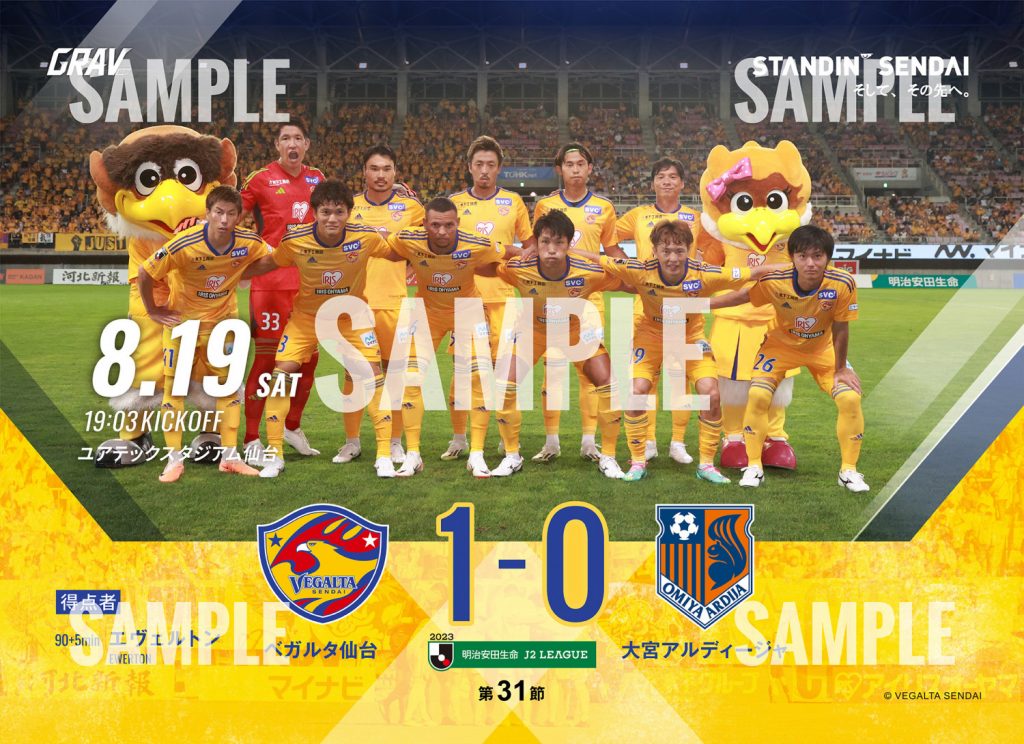 8月19日(土)開催、明治安田生命J2リーグ 第31節 大宮アルディージャ戦のブロマイドはただいまより購入可能です。ホームゲームにご来場いただき楽しんだ方も、DAZNで観戦いただいた方も、集めて楽しめる商品となります。ぜひ、2023シーズンのベガルタ仙台 全ホームゲームのブロマイドをコンプリートしてください。