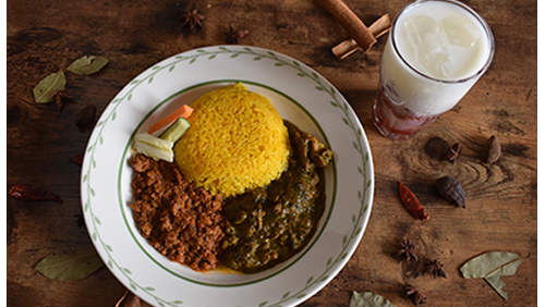 スパイスをふんだんに使ったレモンチキンカレーと牡蠣とキノコカレーの2種類が楽しめる贅沢でお得なカレーです!セットでラッシーも付いてきます!