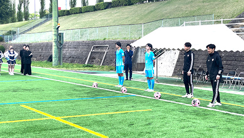 オープニングセレモニーでは、両関係者のあいさつテープカット、キックインセレモニー、応援三者「トレフレッチェ」らからエールをいただきました。終了後には同大学体育会サッカー部に梁勇基クラブコーディネーター、富田晋伍クラブコミュニケーターがサッカー指導を行いました。