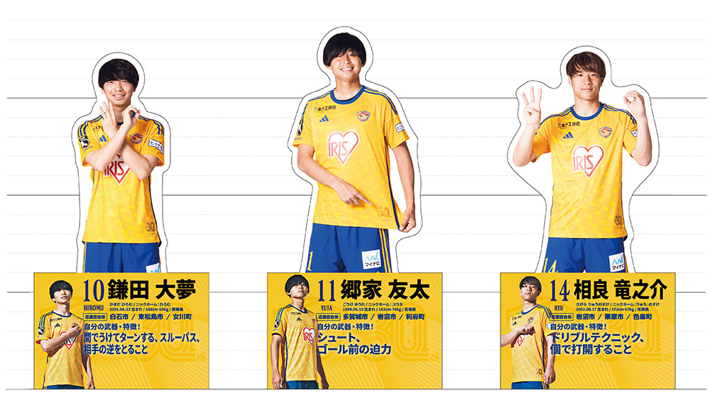 ベガルタ仙台ホームゲームでお馴染みの等身大パネルが今シーズンも全選手登場します。2024シーズンはクラブ設立30周年に併せて、選手それぞれがハンドサインで30を表現、ユニフォームの30thロゴを強調するポーズです。