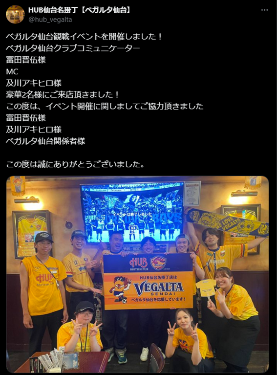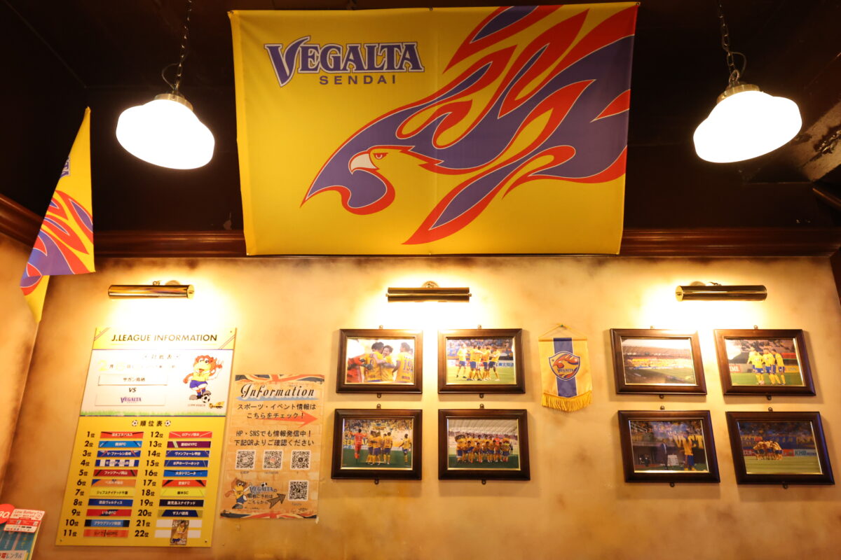 仙台駅から徒歩圏内。英国風パブの雰囲気を楽しみながら、スポーツもお酒も堪能できる人気のスポット。仙台名掛丁店はベガルタ仙台の公式応援店舗としても知られ、試合観戦の際には熱いサポーターたちが集う場所となっている。店内には大型スクリーンが設置され、観戦イベントなども定期的に実施されている。