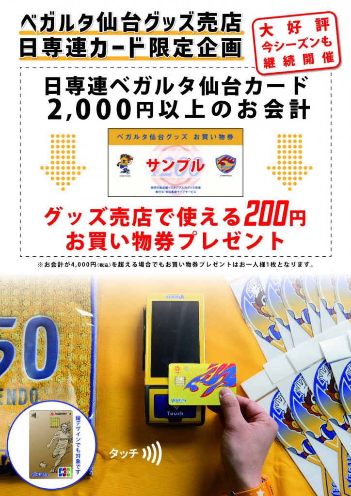 2024シーズンも引き続き、日専連ベガルタ仙台カードでお買い物いただいたお客様へ200円クーポン券をプレゼント!この機会にぜひ日専連ベガルタ仙台カードでお得にベガルタグッズを購入しよう!!