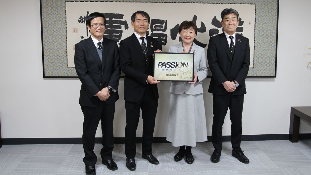 最後には、訪問1時間前に発表されたばかりの2024シーズンスローガン「PASSION 限界を超えろ」に森山監督の直筆サインを入れたパネルを寄贈し、監督自らスローガンに込めた思いを熱くお伝えしました。