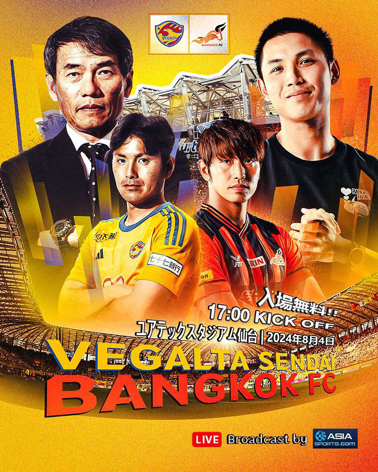 この試合は、ベガルタ仙台が今年1月16日にタイのバンコクFCと締結した包括連携に関する協定に基づき実施いたします。通常のホームゲームとは一部運用、飲食売店の出店状況などが異なりますのでご注意ください。