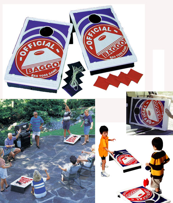 「バッゴー」は、約15cm角のビーンバッグを、傾斜したボードに向かってアンダースローで投げ、得点を競うゲームです。台上にバッグが乗れば1点、ホールに入れば3点となります。