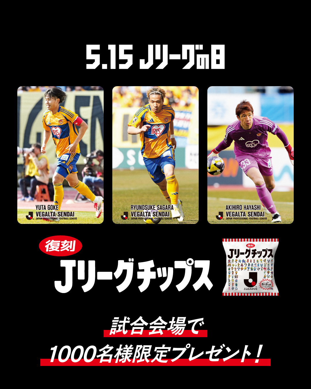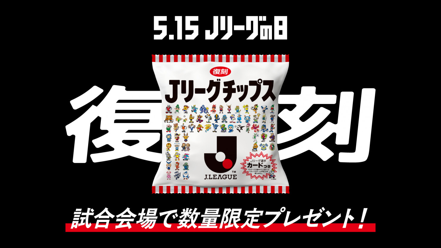 5月31日(土)、明治安田J2リーグ 第18節 北海道コンサドーレ札幌戦にて、5月15日(木)の「Jリーグの日」を記念し、開幕当時に多くのファンに親しまれた「復刻版 Jリーグチップス」を事前抽選で当選された1,000名さまへ無料配布いたします。