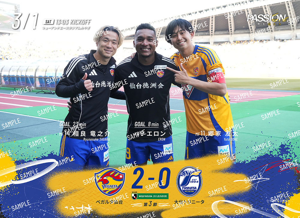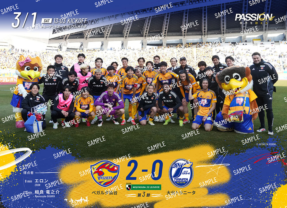 3月1日(土)開催、明治安田J2リーグ 第3節 大分トリニータ戦のブロマイドはただいまより購入可能です。ホームゲームにご来場いただき楽しんだ方も、DAZNで観戦いただいた方も、集めて楽しめる商品となります。ぜひ、2025シーズンのベガルタ仙台 勝利時のホームゲームブロマイドをご購入ください。