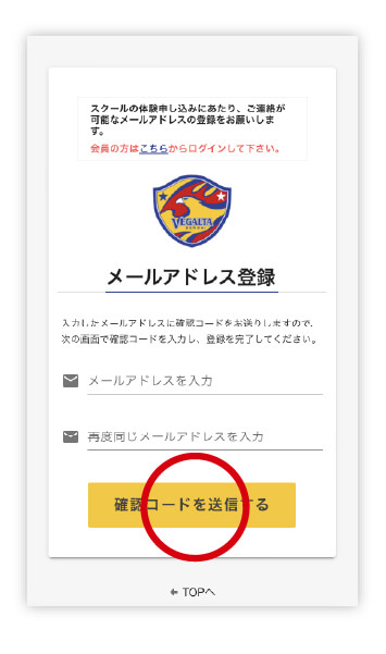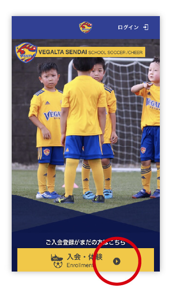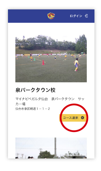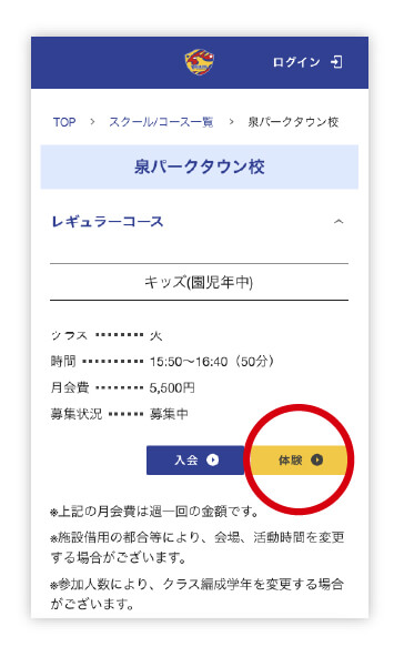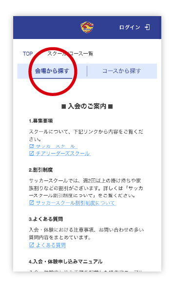体験・入会までの流れ 体験申込方法 入会申込方法 体験申込方法 本サイトや、スクール会場から、ご希望のスクール校、コースをお選びください。 スクール会員ぺージへアクセス。 ①「入会・体験」をクリック ▲ ②「会場から探す」をクリック ▲ ③ご希望の会場から「コース選択」をクリック ▲ ④ご希望の曜日とクラスを選択し、「体験」をクリック ▲ ⑤希望日を選択し、必要情報を入力の上、お申込み 事務局からご連絡いたします。 メールまたはお電話にて、各会場ごとの注意事項や持ち物についてのご連絡をいたします。 体験当日スクール会場までお越しください。 サッカースクールを探す