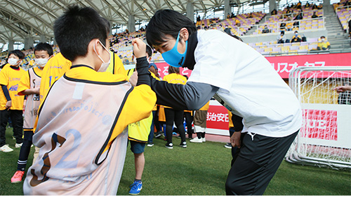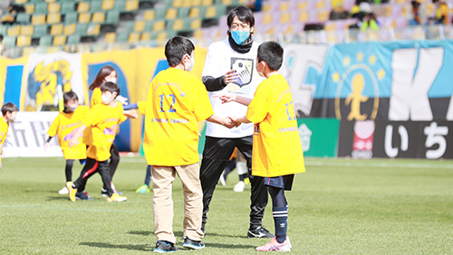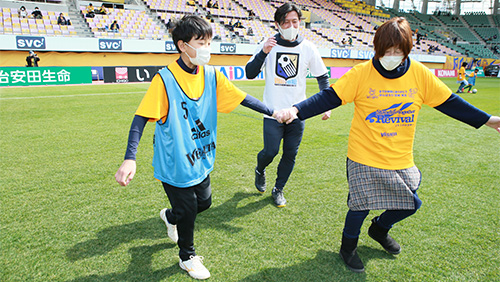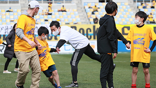 プロジェクト初回となるこの日のユアスタでは、宮城教育大学 防災教育研修機構 小田隆史 副機構長をお迎えし、災害時の避難方法などを取り入れた「防災サッカー教室」や「復興トークショー」などを行い、元ベガルタ仙台の太田吉彰氏、田村直也氏や、昨年現役を引退した元川崎フロンターレの中村憲剛氏らとともに27組57名の親子のみなさんが参加しました。