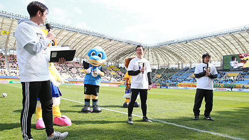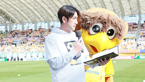 試合前のピッチでトークショー