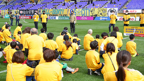 「防災サッカー教室」では、宮城教育大学 防災教育研修機構 副機構長・准教授 小田隆史ゼミ所属 吉川征吾氏をお迎えし、災害時の避難方法などを取り入れたサッカー教室を行いました。参加者は宮城県内の親子41組82名さま、アイリスオーヤマさまより教室後の試合観戦もご招待をいただきました。