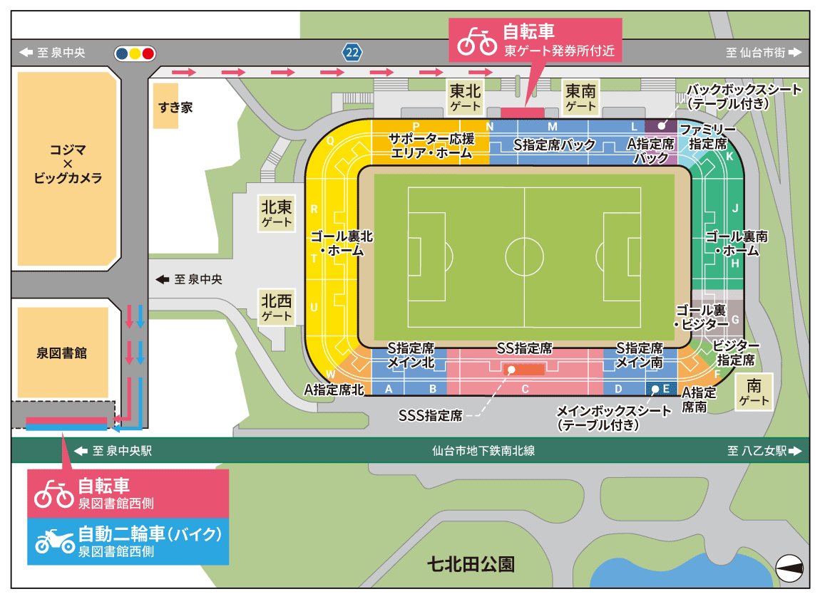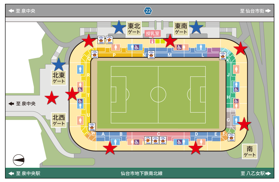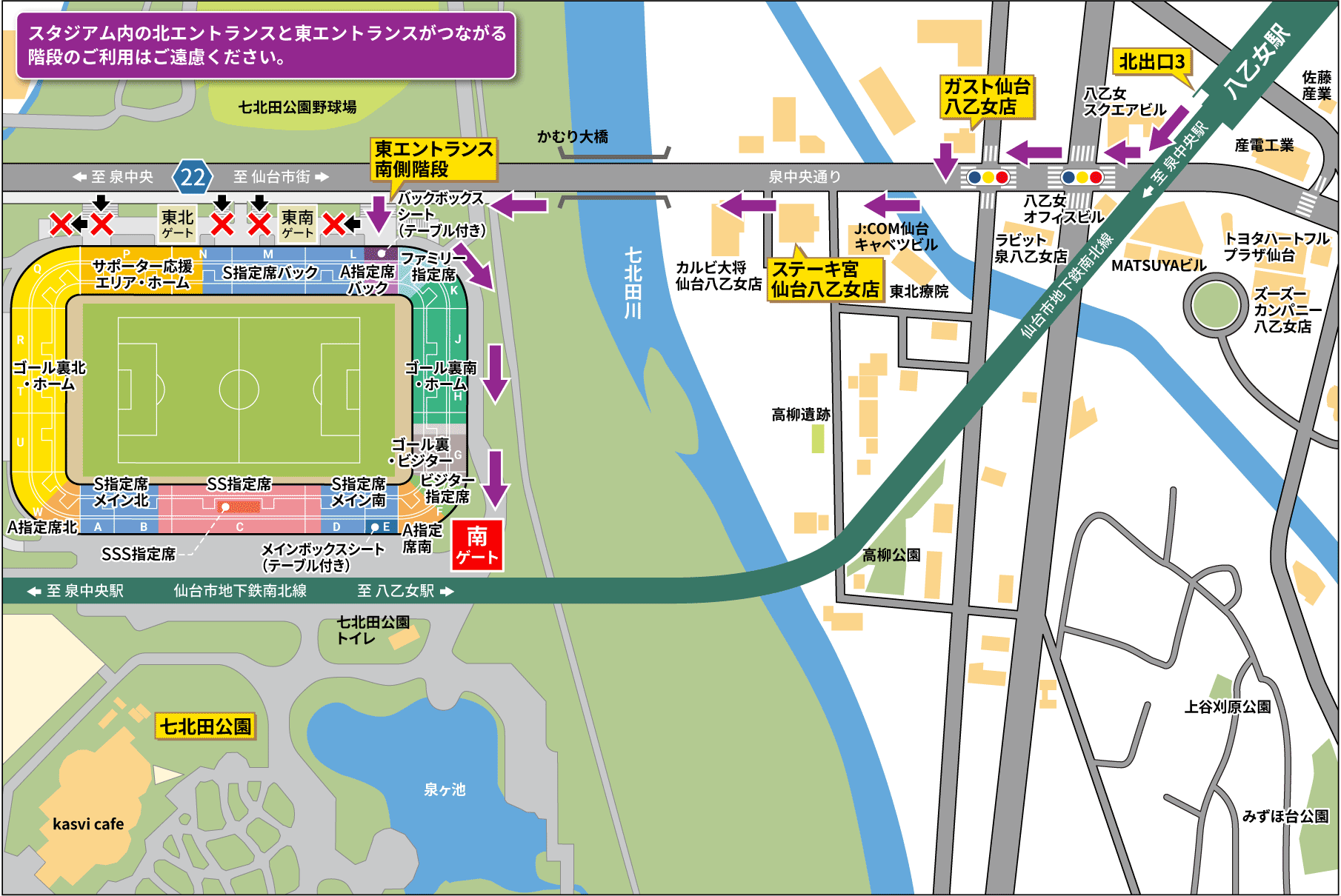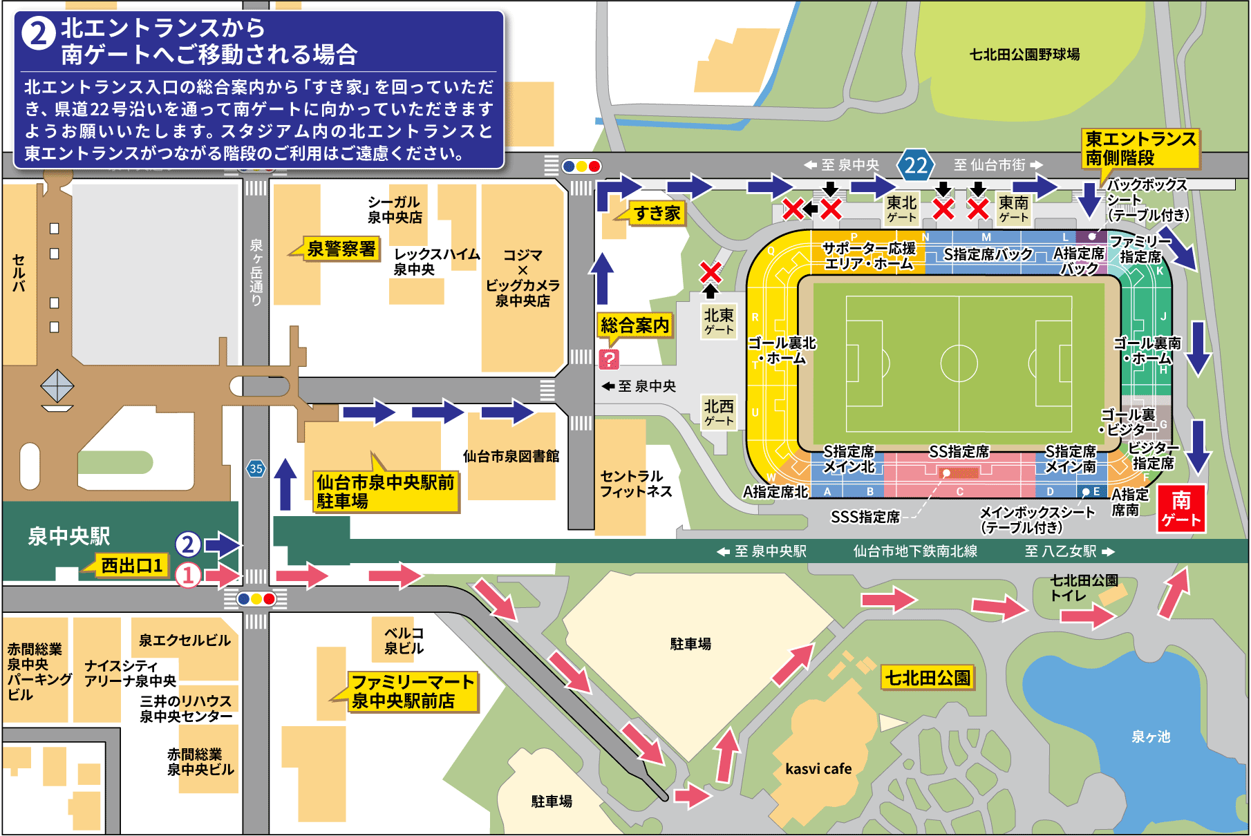 ※北エントランスから南ゲートへご移動される場合は北エントランス入口の総合案内からすき家を回っていただき、県道22号沿いを通って南ゲートに向かっていただきますようお願いいたします。スタジアム内の北エントランスから東エントランスにつながる階段のご利用はご遠慮ください。