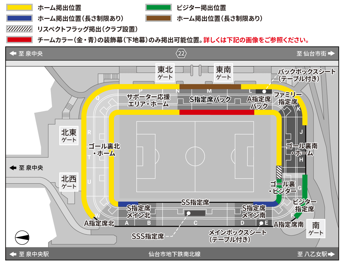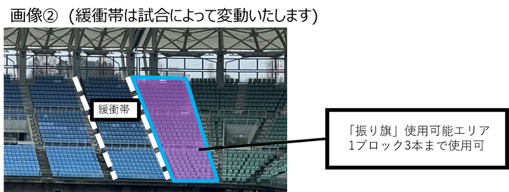 ※試合により緩衝地帯の設置場所が変更する関係で、横断幕の掲出場所も変わる可能性があります。クラブスタッフおよび警備員の案内や指示に従ってください。