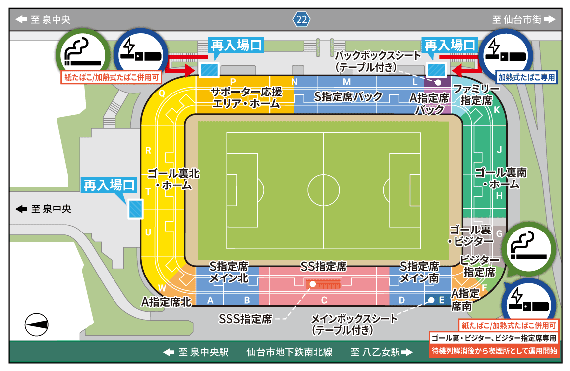 ・東北、東南の喫煙所については、スタジアム内道路を渡る必要がございますので、車両の通行にご注意ください。