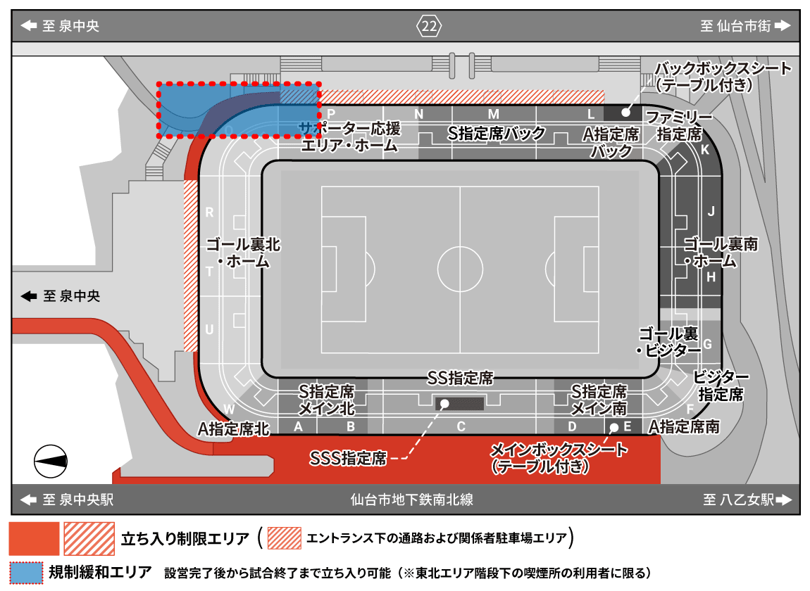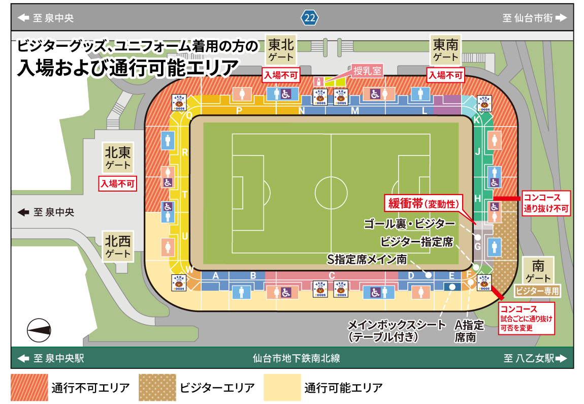 ・ビジター指定席、ゴール裏・ビジターの方は南ゲートからのみご入場いただけます。南ゲート以外のゲートからは入場できません。