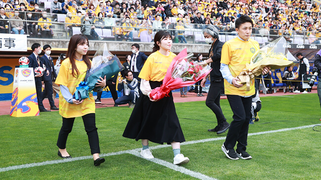 キックオフ直前に両チームキャプテン、主審に花束贈呈を行うイベントに参加できます。(最大3名)