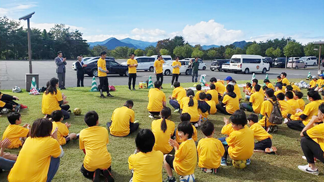 宮城県内の小学校に訪問し、授業の一環として貴社名の冠をつけたサッカー教室を行ないます。