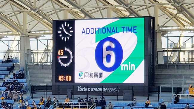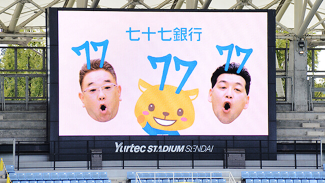 ベガルタ仙台の得点時や入場者数発表の際などにスタジアムビジョンに貴社名を掲出いたします。