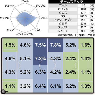 | 4 | C大阪 | 22(12) | 6 | 4 | 2 | 9 |