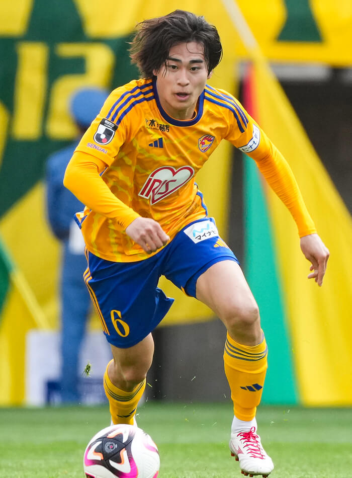 仙台に新しい風を吹き込んでいるボランチだ。相手のプレッシャーを恐れず、それ以上の強さで球際の争いを制する。相手の速攻の前に立ち塞がり、スピードアップする前に食い止める。「それが僕の持ち味なので」と涼しい顔で話すが、間違いなくMF6松井蓮之は中盤のファイターだ。